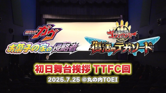 『仮面ライダーガヴ お菓子の家の侵略者』『ナンバーワン戦隊ゴジュウジャー 復活のテガソード』の公開初日、2025年7月25日(金)に丸の内TOEIで行われたTTFC会員限定回(2回目19:30の回)の「初日舞台挨拶TTFC回」映像。舞台挨拶には『仮面ライダーガヴ お菓子の家の侵略者』と『ナンバーワン戦隊ゴジュウジャー 復活のテガソード』のキャストが揃って登壇! 事前に募集したTTFC会員からの質問にキャスト一同が答えます!