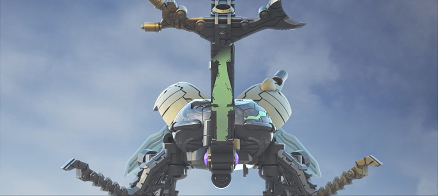 コンセプトアートを元に、まずはどれくらいの広さなのか、どんなバランスで構築されているのか、人間との対比は?など、大雑把な空間の概念を監督が制作しました。以前紹介したコンセプトアートのお城の高さを街の位置より高くするため、通称・機械樹という内側がエレベーター状になっている円柱で城の四方を囲み、そこから通称・剣の道をお城に向かって延ばすことになりました。